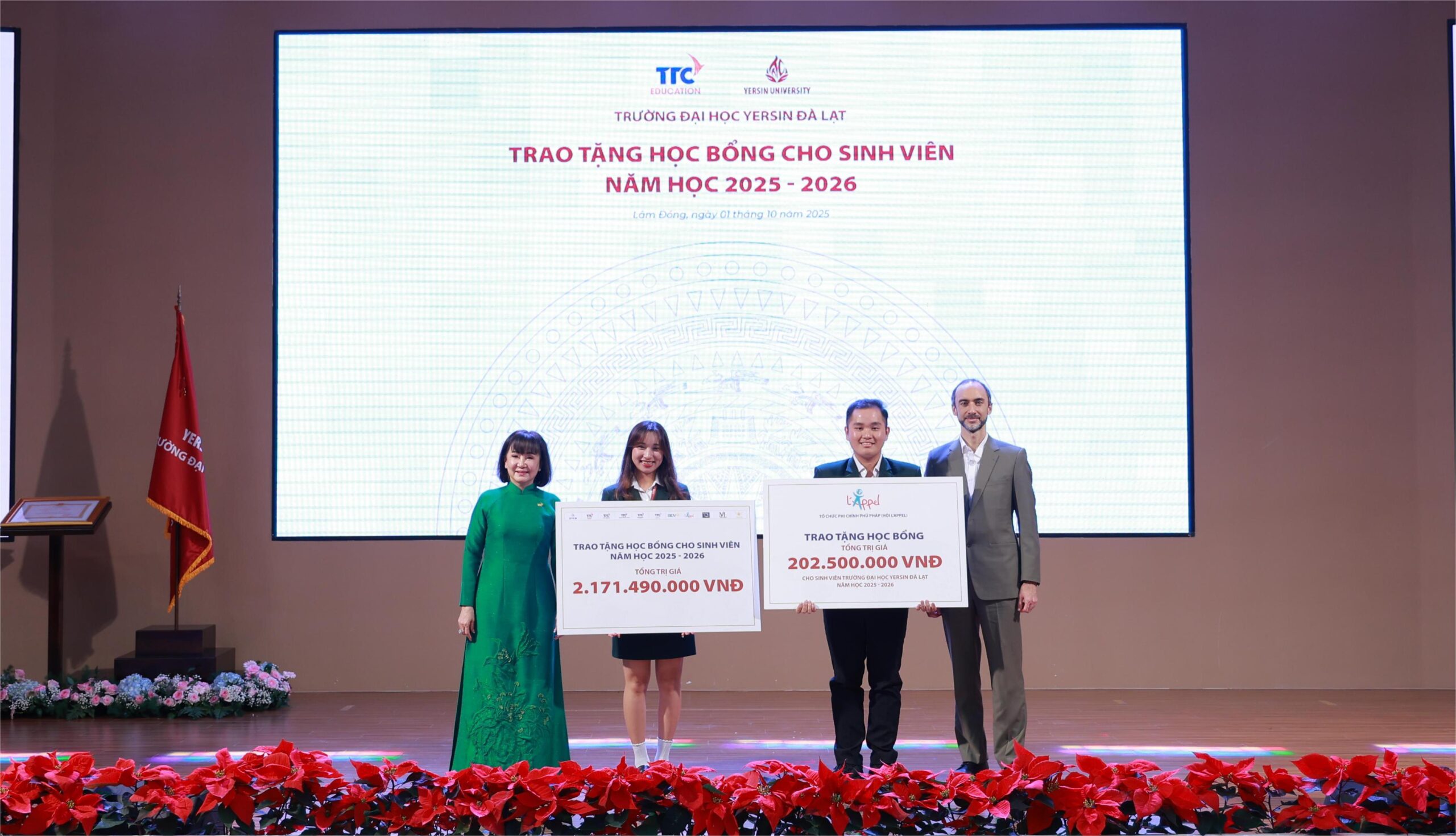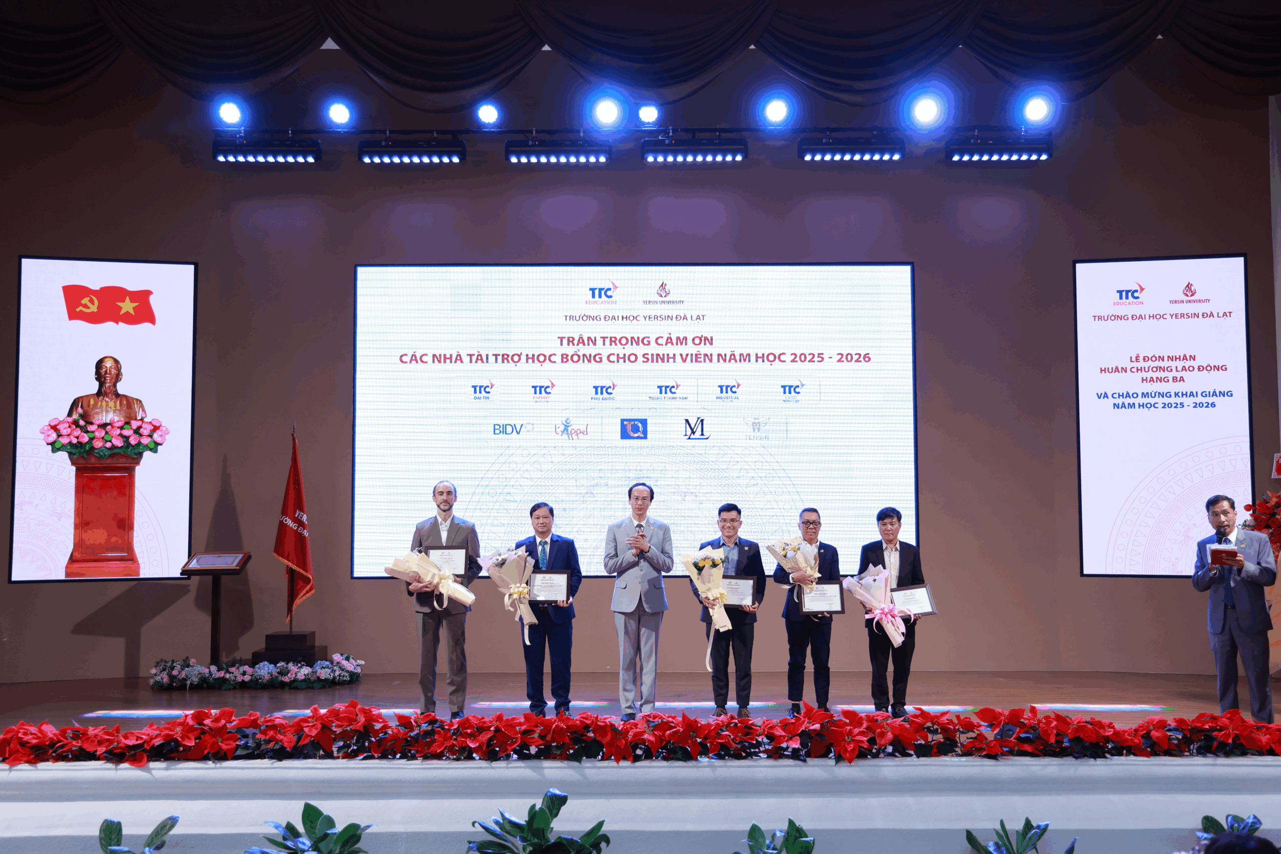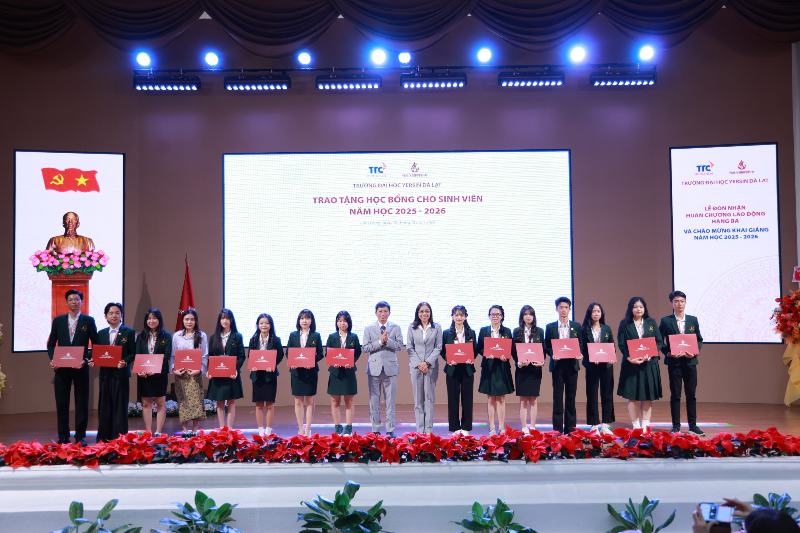 Năm học 2025 – 2026, Trường Đại học Yersin Đà Lạt chào đón gần 1,400 tân Sinh viên. Cũng trong dịp này, Nhà trường đã trao tặng 218 suất học bổng cho sinh viên trị giá hơn 2 tỷ đồng, với sự đồng hành tài trợ từ các Công ty thành viên trực thuộc Tập đoàn TTC và các doanh nghiệp, đối tác bên ngoài như Tổ chức Phi chính phủ Pháp (Hội L’Appel); ngân hàng BIDV; Nha khoa Tenshi; Công ty TNHH Thanh Quang…